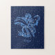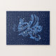 Quebra-cabeça com o símbolo do zodíaco de Virgo em azul-prata-suave, sobreposto com as estrelas da constelação, contra um fundo do céu estrelado formando de azul-da-meia-noite para preto.