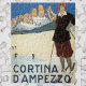 Ilustração vinda da poster de viagens europeia de Cortina d'Ampezzo, Itália, com uma mulher esquiando numa estação de esqui nas montanhas dos Alpes italianos.