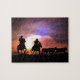 Um quebra-cabeça divertido de cowboys dirigindo um rebanho de gado para casa. Uma imagem da arte ocidental do país com cores incríveis!
