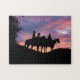 Três cowboys em seus cavalos numa colina enquanto o sol se põe atrás deles em nuvens coloridas.