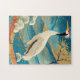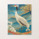 This jigsaw puzzle features a stunning white red and black stork against blue and teal mountains with fall trees tipped in gold. Heavily influenced by traditional Japanese art (Ukiyo-e style), this red-crowned crane symbolizes longevity and good fortune.