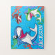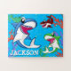 Este design de tubarão ilustrado e bonito é excelente para o amante do tubarão em sua vida. Estes tubarões azuis, vermelhos e verdes farão com que a construção desta quebra-cabeça seja divertida para crianças, rapazes e raparigas. O nome de texto branco e azul é personalizável!