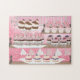Meninas vão adorar este quebra-cabeça de puzzle de padaria francês. Cupcakes bonitos com espirais de glacé cor-de-rosa revestidos com morangos e aspersores. O fundo cor-de-rosa brilha para uma pastelaria mágica e doce.