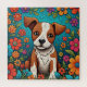 Arte aérea branca adorável com um cachorrinho castanho e branco rodeado por flores de arte folclórica, cor-de-rosa, laranja e roxo.
