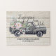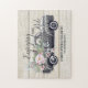 Um belo e falho sol soprou fundo de madeira, um clássico caminhão de vintagem, ao lado do campo, cheio de lindas flores aquáticas e de torres de folhas de eucalipto, e o sentimento "Aproveitando a carona junto" com os nomes da noiva e do noivo e a data "estabelecida". Esta quebra-cabeça de serra divertida faz o dom perfeito de novo, inauguração de casa ou aniversário.