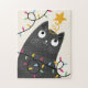 Christmas jigsaw puzzle featuring a cute cat with a tree-topper and Christmas lights.