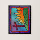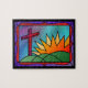 Um design do vidro colorido que ilustra a manhã da páscoa, com uma cruz vermelha que está em colinas verdes ao lado de um nascer do sol impetuoso.