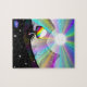 Um quebra-cabeça que caracteriza minha do "paisagem da fantasia da montanha cogumelo", com raios de sol coloridos sobre um cume da montanha.