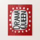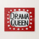 "Rainha do Drama" é um design de texto bonito em vermelho com texto preto, junto com uma forma de sotaque branca e pontos brancos texturizados ao seu redor.