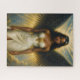 This puzzle features a Black woman with long, dark hair as an angel with black wings. She wears a white dress with gold accents and a laurel wreath accessory on her head. The vintage oil painting style portrait has a heavenly/celestial backdrop with clouds and rays of light.