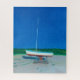 Uma pintura de um único veleiro em um estaleiro em um final de tarde de primavera com um céu azul profundo ao fundo. A obra de arte é sobre esperar o verão começar na Nova Inglaterra e a diversão na água que vem com viver em uma cidade costeira.