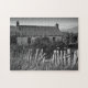 Casa velha abandonada com fotografia de cerca de picape tirada em preto e branco
