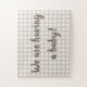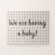 Bonita bege Gingham impressão: "Estamos tendo um bebê!" Quebra-cabeça de anúncio de gravidez para marido, família, amigos