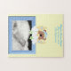 Um quebra-cabeça bonito com fundo amarelo pálido, palavras azuis do céu, quadro azul-céu, e um urso adorável com chapéu azul-noturno, numa lua amarela com nuvens e estrelas. Totalmente personalizado, além do quadro e do urso. Esta seria uma maneira tão fofa de contar aos seus entes queridos sobre o novo bebê e obrigado-los para os seus presentes chás de fraldas.