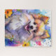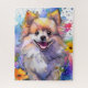 Uma imagem de arte digital de um cão Pomerano alegre é representada com uma forte abertura de cores no fundo, cercado por flores brilhantes e florescentes. O trabalho de arte captura a expressão lúdica e alegre do animal.