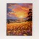 Este quebra-cabeça apresenta uma ilustração vibrante de um pôr do sol sobre um campo de trigo ouro e flores roxas.