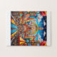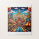 cena vibrante e colorida do parque de diversões. No centro, há uma grande roda-gigante com a palavra "SKYLANE" nela. Ao redor da roda-gigante estão várias estruturas brancas, incluindo torres e tendas com bandeiras. O céu está cheio de balões de ar quente e nuvens fofinhas. Uma multidão arrepiante de visitantes é vista nos caminhos, aproveitando o ambiente festivo. O ambiente é um ambiente de entusiasmo e diversão, típico de um campo de feira ou de um parque temático.