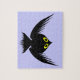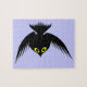 Este incrível design de quebra-cabeça de Halloween apresenta uma imagem em estilo de desenho animado de um corvo. O corvo é preto com olhos amarelos e tem as asas estendidas. O fundo é azul.