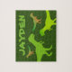 Quebra-cabeça de dinossauro T-rex do garoto com nome personalizado. Ilustração pré-histórica de animais selvagens com texto personalizado. Brincadeira de aniversário ou ideia de presente de Natal para meninos e meninas em dinos. Terranossauro Verde rex silhuetas com modelo de tipografia ousada. Escolha entre peças pequenas ou grandes para brincar. Brinquedos personalizados para crianças.