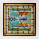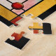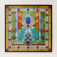 quebra-cabeça de serra de 20" x 20" com a imagem de uma fantasia de vidro manchado criada com vidro vermelho, laranja, amarelo, verde, azul, aqua e cor-de-rosa com design floral, pontilhado com órbitas verdes luminosas e órbitas de cristal vermelho profundo. Veja toda a coleção Este e Aquele Quebra-cabeça na seção HOME.