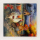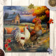 Quebra-cabeça com uma pintura colorida de arte de um galo e galinha com um celeiro de fazenda no fundo. Um quebra-cabeça de família alegre e um presente adorável.