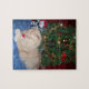 Quebra-cabeça de foto colorida de um gato laranja brincando com um Enfeites de natal embaixo da árvore de Natal.