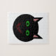 Esta quebra-cabeça espetacular mostra um gato preto com orelhas pontiagudas, olhos verdes brilhantes e um sorriso vermelho-voador. Este gatinho assustador é perfeito para o Halloween ou para amantes de gatos.