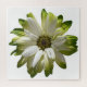 Quebra-cabeça de serra. Uma margarida vibrante com pétalas brancas coladas com verde é centrada sobre um fundo comum. O arranjo simétrico da flor e a vivacidade de suas cores lhe dão uma aparência nova, semelhante à da vida.