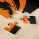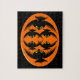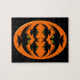 Este incrível design de Halloween quebra-cabeça apresenta um oval laranja com seis corvos. Cada corvo tem olhos amarelos com pupilas pretas e asas salientes. Os corvos voam em direção uns aos outros formando uma forma oval. O fundo é preto.
