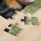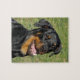 Esta quebra-cabeça mostra meu lindo alemão Rottweiler, Heidi, enquanto ela senta na grama e inclina sua cabeça para o lado, esperando que joguemos seu brinquedo favorito... um balde.