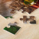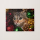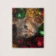 O festivo jig de Natal viu quebra-cabeça com um gato giro a espreitar através da decoração da coroa de Natal. Mede 8" x 10" polegadas. 110 peças.