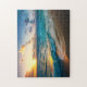 Este quebra-cabeça de jogo é mostrado com um impressão de foto de uma linda cena tropical de praia por pôr do sol.
