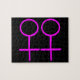 Este quebra-cabeça fantástico foi projetado para lésbicas. Ele apresenta dois símbolos femininos cor-de-rosa, lado a lado. O fundo é preto.