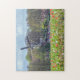 Uma bela vista de um moinho de vento na Holanda a partir dos campos de tulipas impressos num quebra-cabeça.