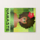 Uma fêmea atrativa com um afro em um fundo verde que diz Namaste que o significado da saudação de Namaste é "o espírito do deus/deusa dentro de mim reconhece e honra o espírito do deus/deusa dentro de você." Um sentimento bonito - nós somos um
