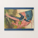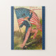 quebra-cabeça de serra de 11" x 14" com uma imagem de vintage do tio Sam segurando uma bandeira americana com um pé no cânone. O texto diz, "Dê-nos Independência." Veja toda a coleção de Quebra-cabeça do Dia de Independência na categoria HOME na seção HOLIDAYS.