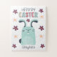 quebra-cabeça de páscoa para crianças, com flores e um belo coelho de desenho animado. A legenda diz Felz pascoa. Personalizável com o nome da criança.