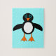 Esta quebra-cabeça espetacular apresenta um caráter pinguim giro com uma barriga branca, grandes olhos azuis com pupilas pretas e pés cor de laranja e bico. Esta pequena ave de inverno encantadora encanta crianças e adultos. O pinguim se senta sobre um fundo azul pálido e gelado para lembrá-lo de sua casa ártica infantil.