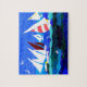 Um quebra-cabeça de serra de vaivém com barcos de navigação e gaivotas, de uma colagem de papel pintado à mão por Judy Adamson. Outros produtos e cartões com este design estão disponíveis em minha loja.