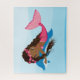 Esta quebra-cabeça de serra de serra está em cores rosa e azul. A quebra-cabeça é projetada com uma bela sereia africana-americana com rabo de peixe rosa, encaracolado, cabelos longos e golfinhos. Esta quebra-cabeça de sereia é um presente ideal para as meninas para qualquer tipo de celebração.