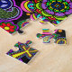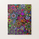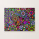 Um quebra-cabeça de serra de vaivém com um design vívido e colorido de sinais de paz, de paisley, de ankhs, de corações, e de flores. Um flash far-out de volta aos anos 60.