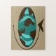 Viagem em todo o mundo com este quebra-cabeça de serra de vaivém moderno da arte do globo do meio século. As características de design um globo oval abstrato com os continentes de madeira da grão. Os oceanos estão nas máscaras da cerceta e da turquesa. O globo está em um suporte de madeira triangular e o mundo inteiro está em um fundo colorido trigo.