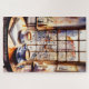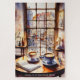 Quebra-cabeça com uma pintura aquosa de dois cafés em uma sala retrô com uma janela sobre uma rua urbana. Lembrem-se: esta pintura tem vários erros, acrescentando um desafio extra!
