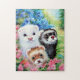 Três doces furões apreciam as flores de verão...excelente de presente para o amante de furões na sua lista....image da minha arte original