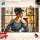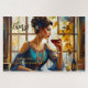 Quebra-cabeça divertido com uma pintura colorida de uma senhora bebendo um copo de vinho tinto. Bonita para qualquer amante de vinho.