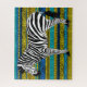 Ilustração de zebra negra e branca sobre um fundo de padrões africanos em tons de azul, amarelo e preto.