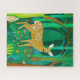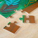 Quebra-cabeça numa ilustração estilizada de uma pintura fofa, vista num cenário de conto de fadas, rodeada por árvores e plantas, em tons de marrom e verde