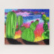 Cores brilhantes do pôr do sol no deserto com cacto no primeiro plano. Trabalho de arte de pontos por Deanna Pendrick.