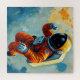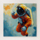 Um astronauta num traje espacial laranja coloca-se contra um pano de fundo cósmico vibrante cheio de raios coloridos e planetas distantes. A cena exude um senso de exploração e aventura em meio a uma paisagem surreal e extraterrestre.