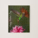 Belo beija-flor em voo para comida da flor. Este é um quebra-cabeça meio desafiador.